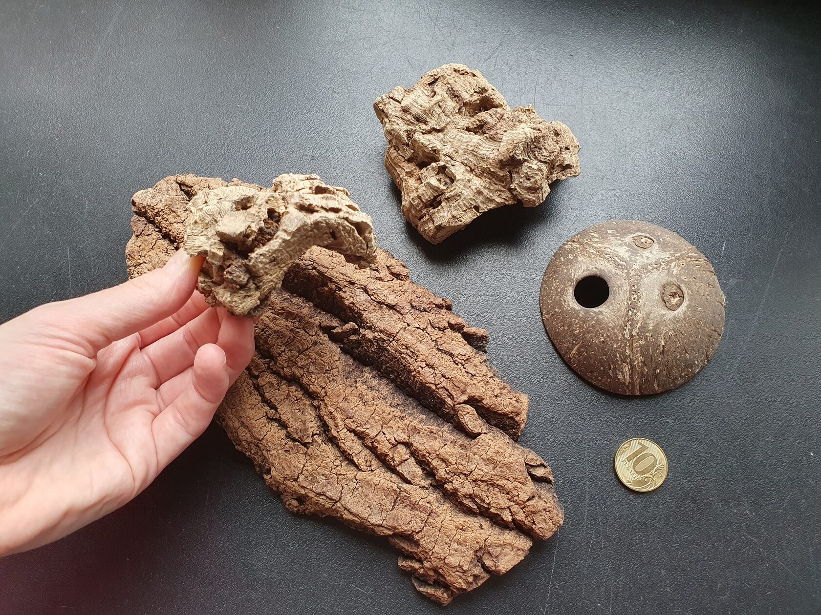 Важно: бóльший размер контейнера допустим, но требует активного наполнения (большой слой наполнителя, множество укрытий, коряг, веток), особенно для молодых животных. Не обязательно использовать сложный декор — подойдут простые и доступные вещи: тубы из пробковой коры, куски коры, втулки, пластиковые укрытия. Искусственные растения и коряги можно добавить как дополнение.