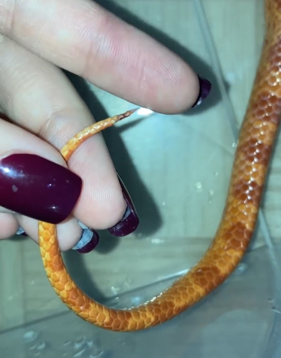 - Обратите внимание на кончик хвоста. Если после линьки он выглядит отёчным, тёмным или с признаками некроза (как на фото) — срочно к ветеринару-герпетологу! Возможно нарушение кровообращения, которое требует хирургического вмешательства.