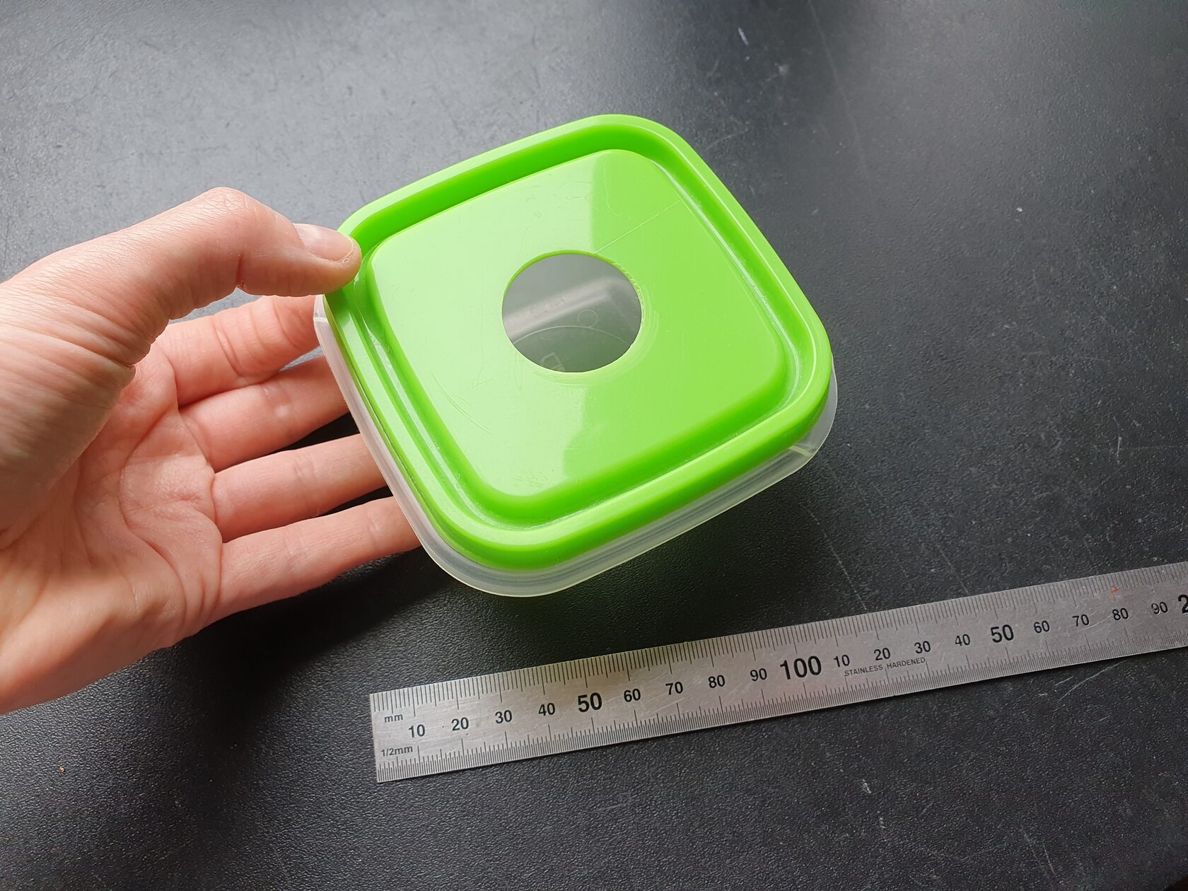 - Возьмите небольшой контейнер с крышкой, прорежьте вход.